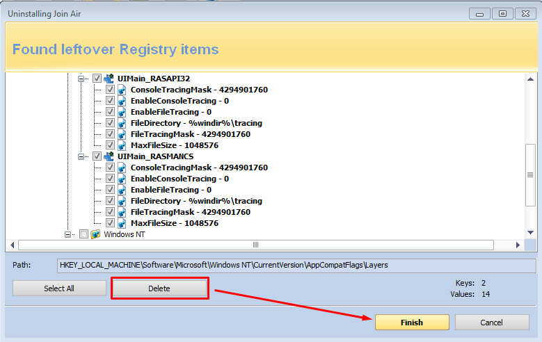 Usai program selesai di uninstall, pada scaning modes pilihlah mode advanced dan lakukan scanning. Tunggu beberapa saat maka akan muncul daftar registry yang sudah tidak terpakai dari program yang telah kita uninstall. Hapus registry tersebut lalu tekan finish